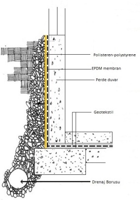 Perdenin alt tarafları temel altından perdeye dönen membran ile birleştirilir. Membran strapor, geotextil keçe veya drenaj levhası vb. malzeme ile korumaya alınarak tuğla veya toprak ile kapatılır